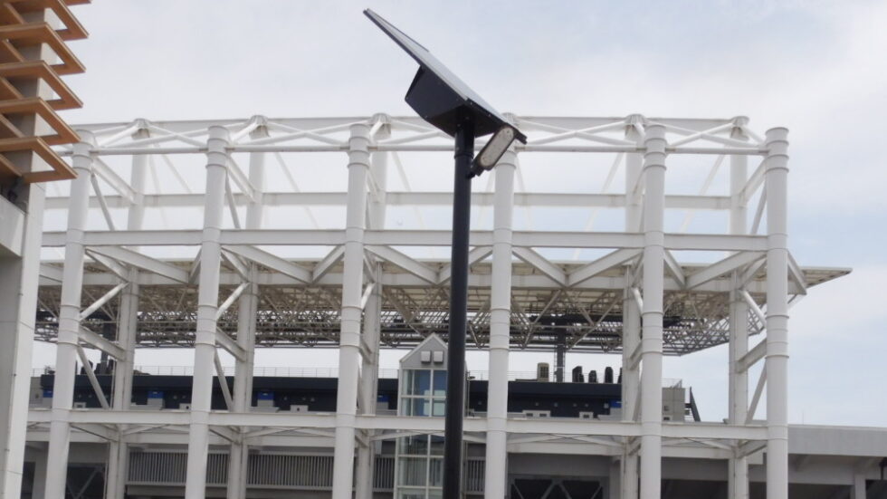 総合運動公園の外交部分のLED化 災害時の避難路は、ソーラー照明を連続的に配置し、停電に対応する。